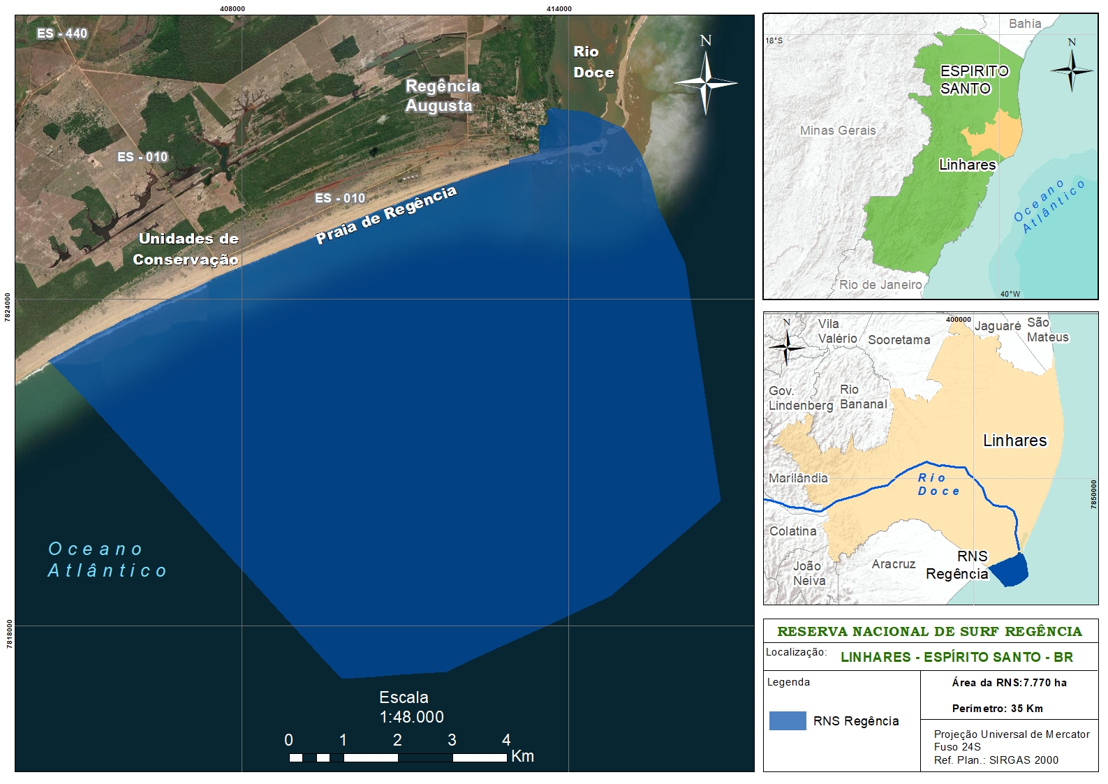 A área delimitada para a Reserva Nacional de Surf de Regência Augusta contém muitos picos, todos intensamente influenciados pelo Rio Doce. As condições de ondas fazem das praias de Regência um local único, com a prática do surf bastante frequente ao longo de todo ano.